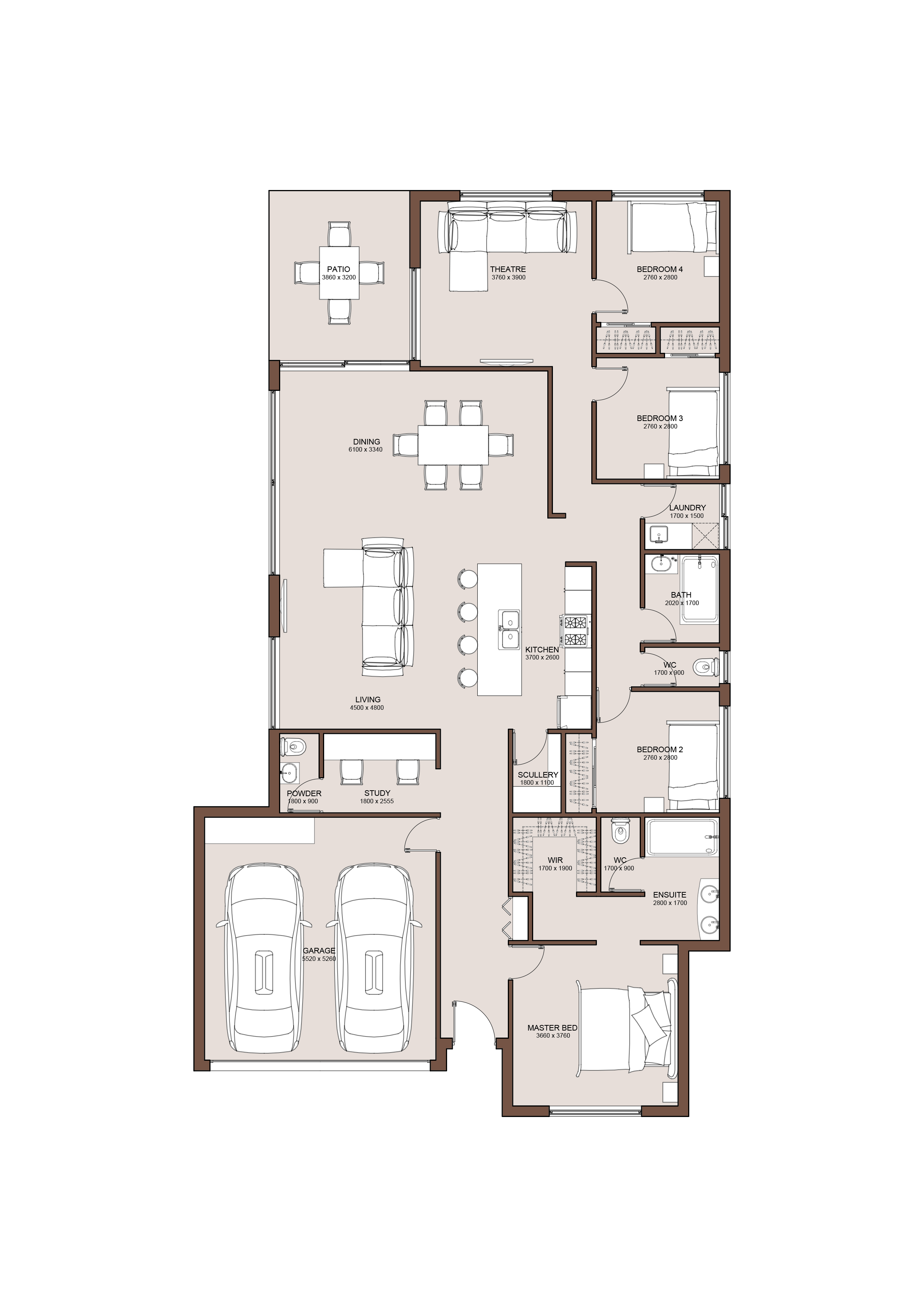 The master suite is positioned at the front, creating a private retreat, while the secondary bedrooms are located toward the rear for separation. At the centre of the home, the kitchen, dining, and living areas connect seamlessly, supported by a dedicated theatre and study to provide flexibility for both relaxation and productivity.